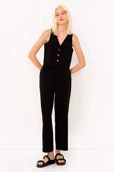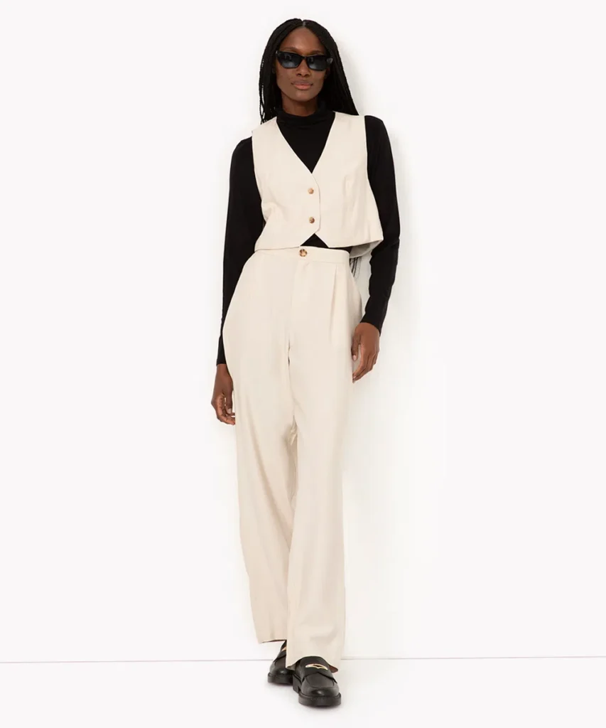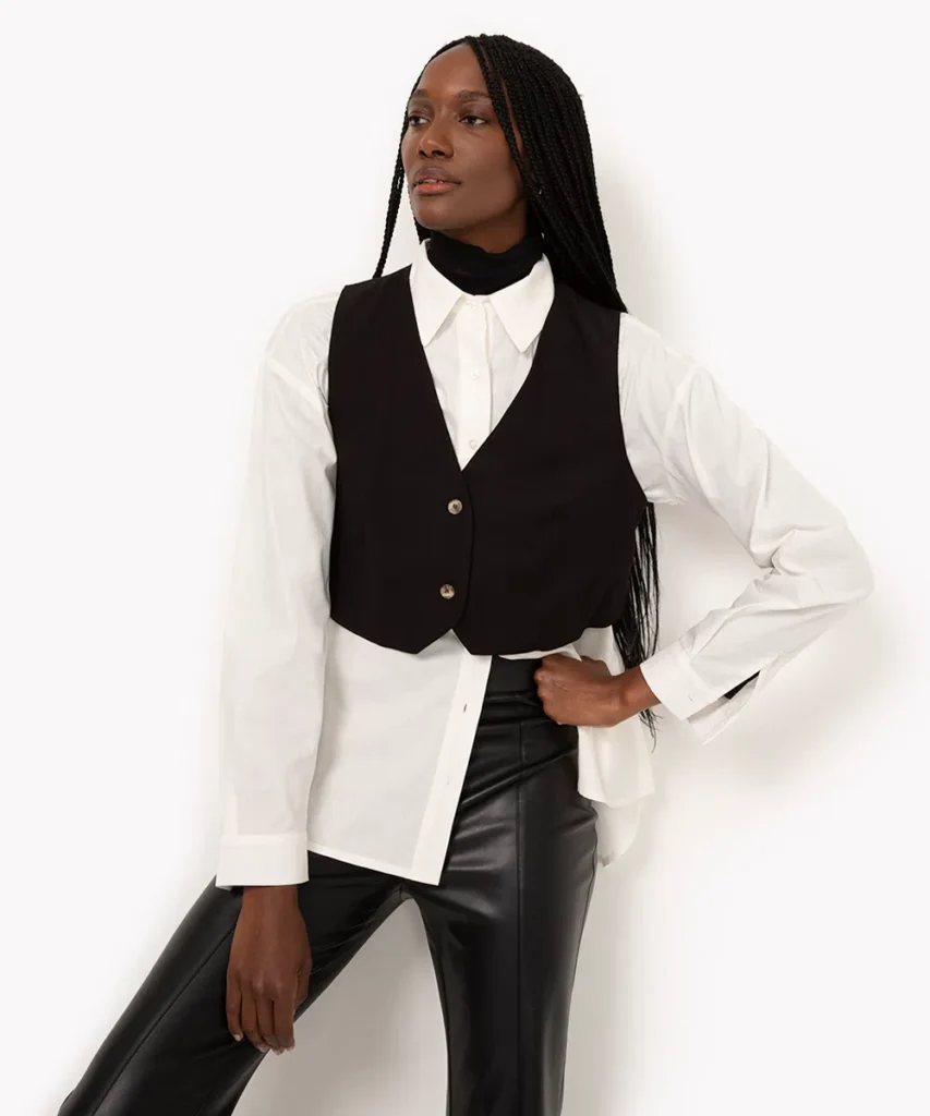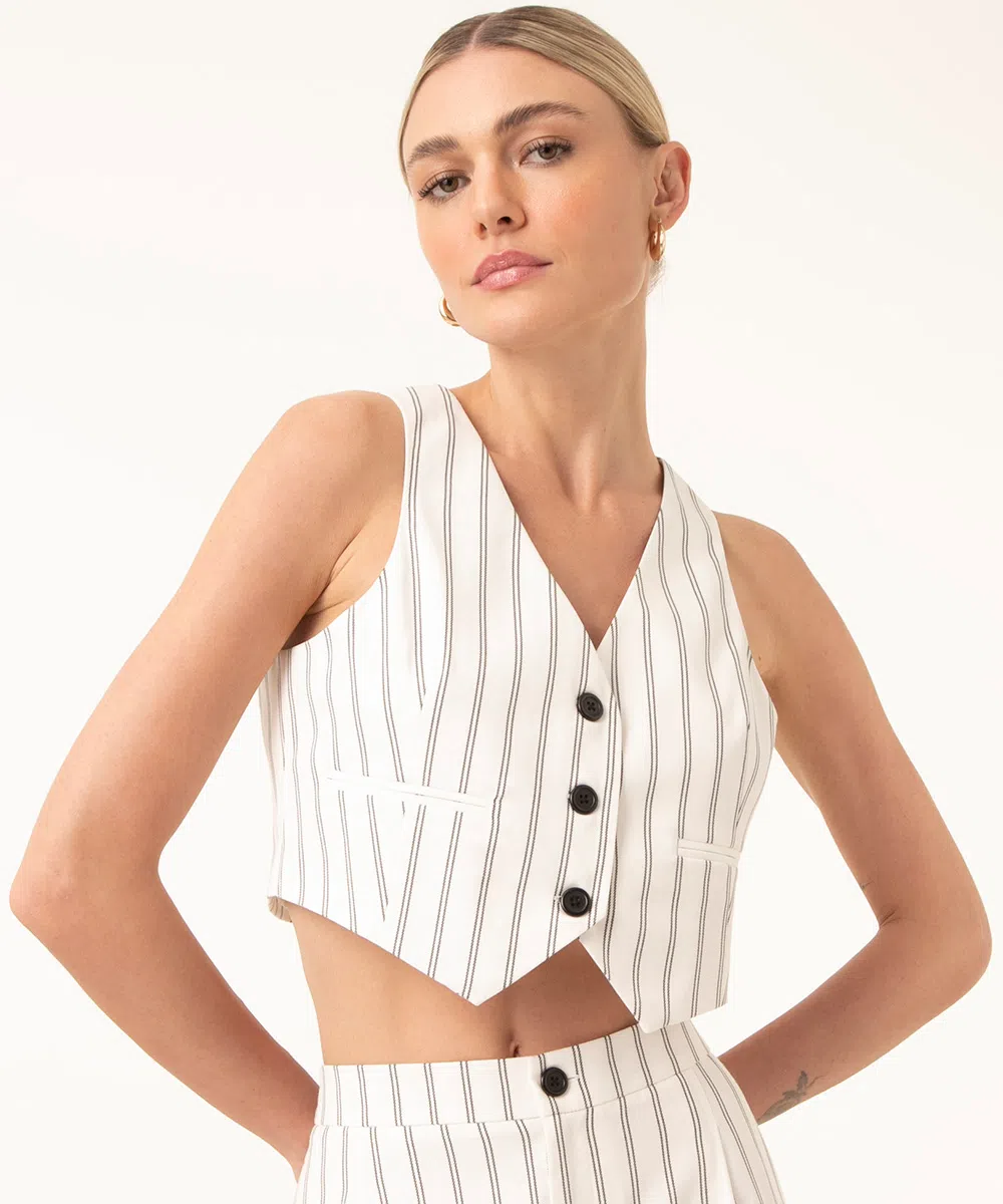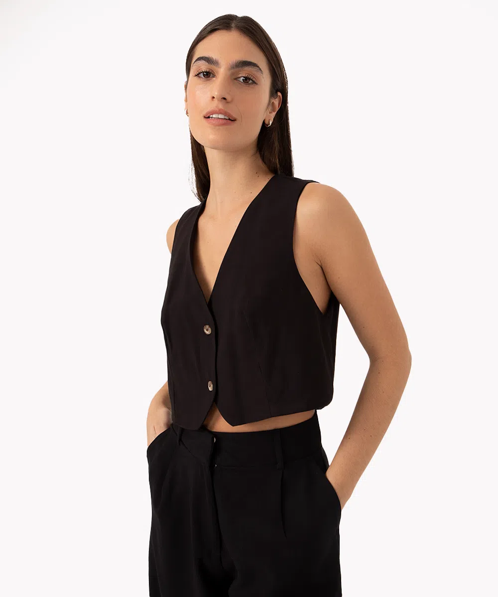 Por outro lado, se você prefere um estilo mais descontraído e moderno, o colete de alfaiataria cropped é ideal. Ele adiciona um toque ousado ao visual, mostrando um pouco da cintura ou da blusa que está usando por baixo, mas também pode ser usado sozinho.