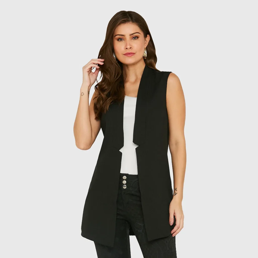 Se você quer um look formal e elegante, o colete alfaiataria longo é uma excelente escolha. Ele adiciona um ar sofisticado e é perfeito para eventos mais requintados, como jantares ou festas noturnas. Além disso, o colete longo ajuda a alongar a silhueta, criando uma aparência mais estilizada.